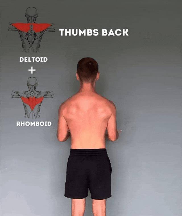 保持上一動作的準備姿勢呼氣,肩膀內旋整個上背部完全撐開的感覺吸氣,肩膀外旋感受肩胛骨向中間靠攏重復練習12-15次