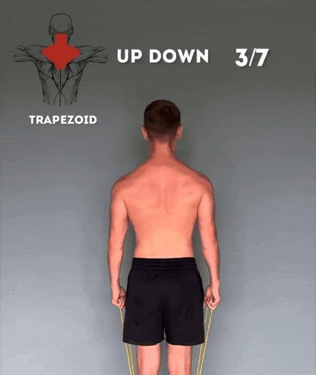 山式站立,雙腳掌下方踩住彈力帶雙手拉住彈力帶的兩端呼氣,收緊核心雙手交替向上提拉彈力帶整個肩胛骨向上收縮,吸氣,還原重復練習12-15次為一組,重復3-5組