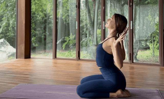 雙膝落地,進入金剛坐呼氣,收緊核心,含胸弓背,雙手向前吸氣,打開胸腔,雙手向后拉重復練習10-12次練習這個動作前可以用泡沫軸滾動一下背部