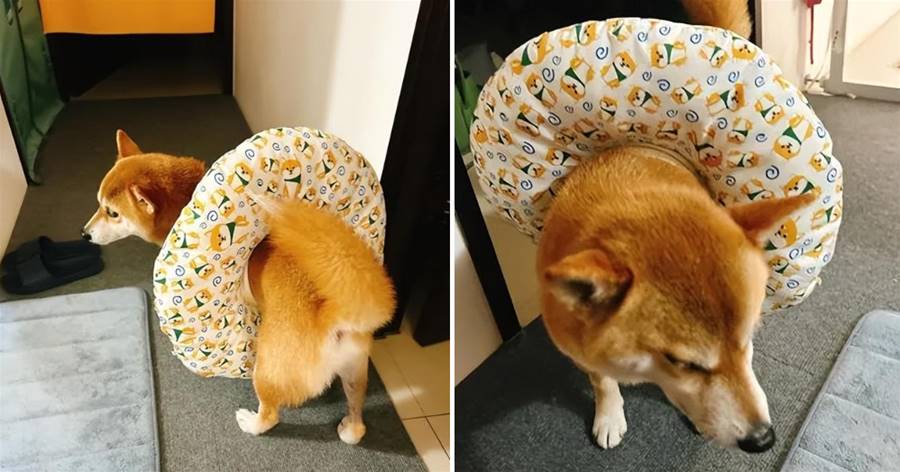 主人Beatrice Chang家中有只5歲大的赤柴(吉祥)調皮又可愛,這天它竟然把將防舔圈戴在腰間,就像是游泳圈一般。。