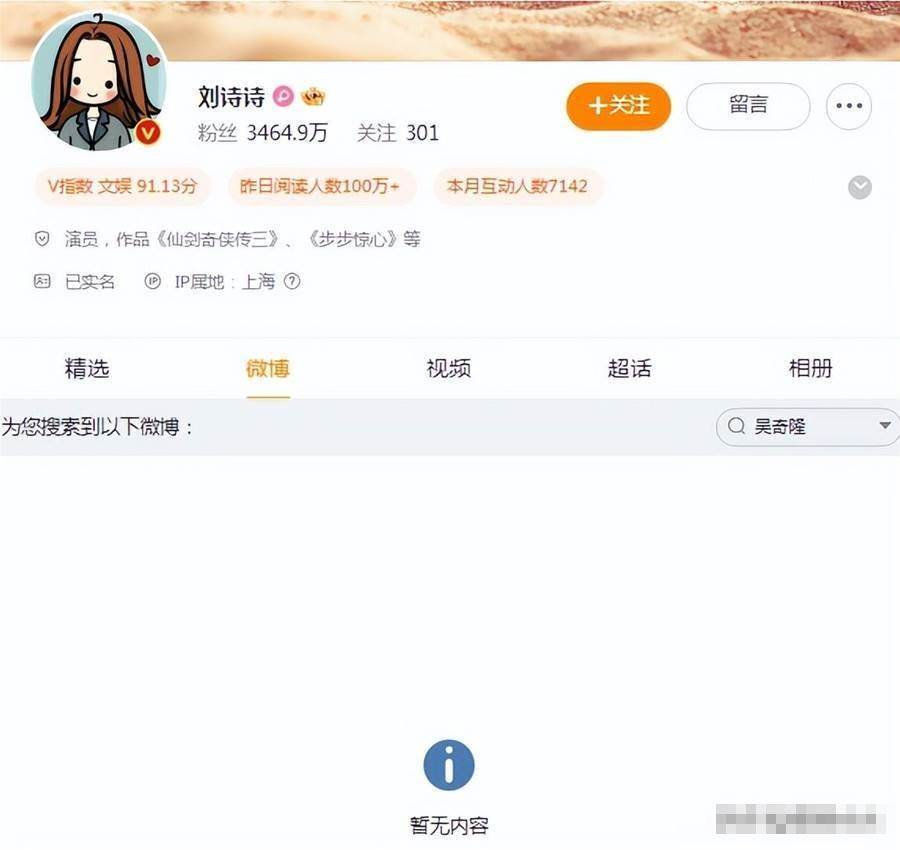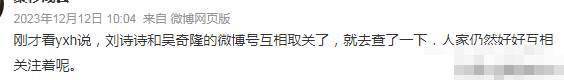 另外,劉詩詩和吳奇隆上一回傳失婚還是2023年年末。當時,有消息稱劉詩詩和吳奇隆正在走失婚手續,還傳兩人互相取關了。實際上,劉詩詩和吳奇隆并沒有取關,但劉詩詩的微博主頁確實查不到吳奇隆相關內容。而吳奇隆的微博依舊保留了劉詩詩的痕跡,但互動都是幾年前的,時間線停留在2019年。