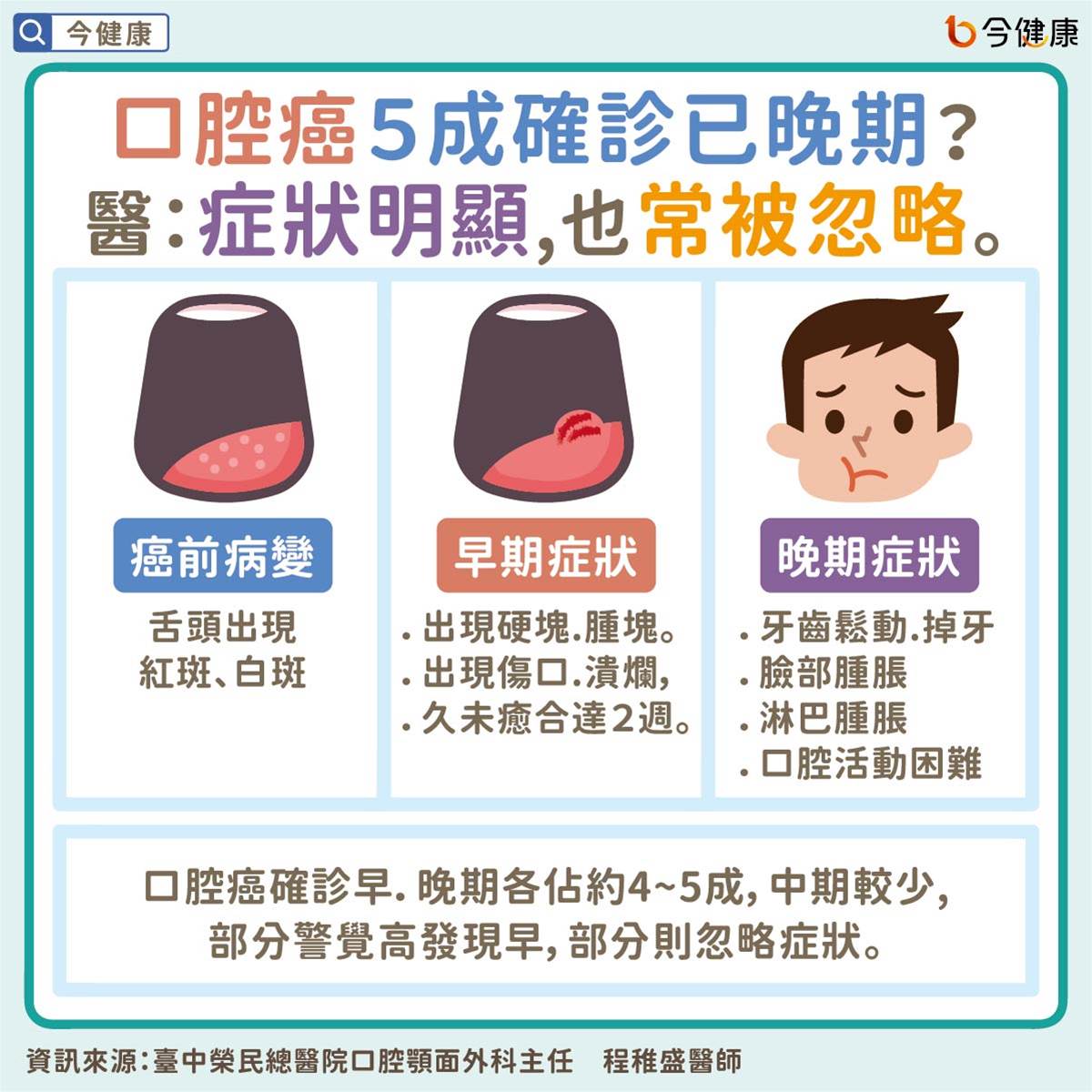 程稚盛表示,口腔癌早期確診者約佔4~5成,但相當極端的是,晚期患者比例也約佔4~5成,中期確診者相對明顯較少,晚期發現導致存活率不佳,原因可能在于癥狀容易被患者忽略。