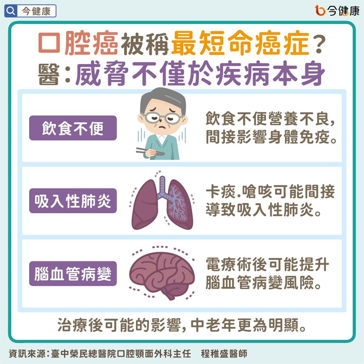 程稚盛指出,口腔癌患者容易卡痰、嗆咳,增加吸入性肺炎的風險。接受電療後也會有腦血管病變可能。雖然口腔癌未必如外界傳言是「最短命」癌癥,也有不少病患成功克服生活困難,但以統計數據來看確實明顯減少患者的存活,甚至有減損預期壽命超過10年的趨勢。