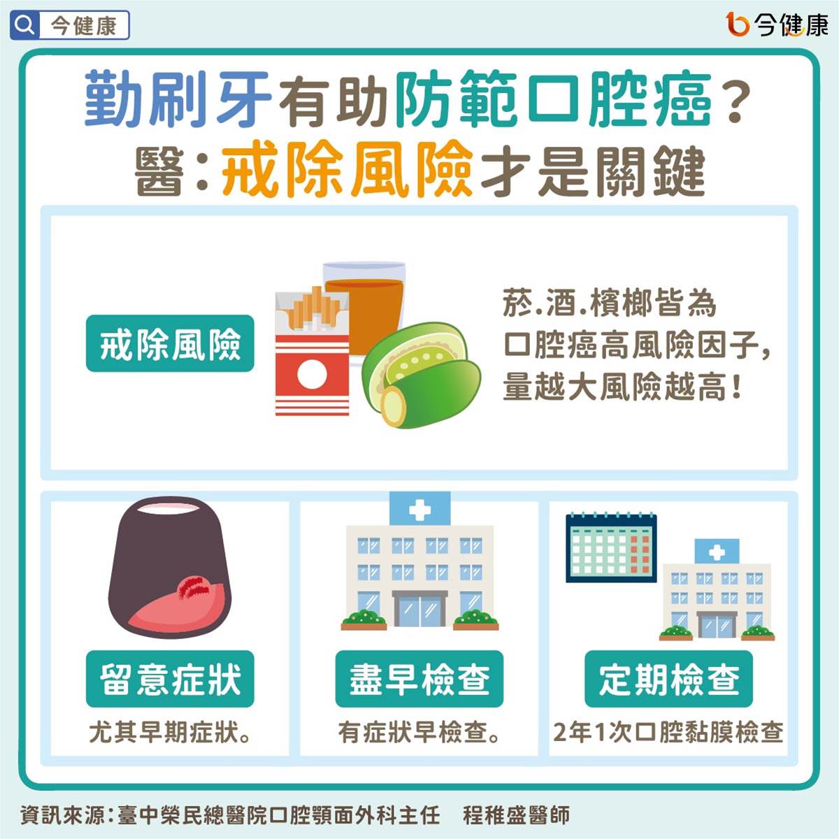 多刷牙、刷舌苔是否有助預防口腔癌?程稚盛指出,雖然勤刷牙可改善口腔環境,有助減少口腔細菌,不過對于口腔癌而言,菸、酒、檳榔等不良習慣,才是最主要的關鍵。而且在一般情況,並不會鼓勵刷舌苔,避免組織受傷。