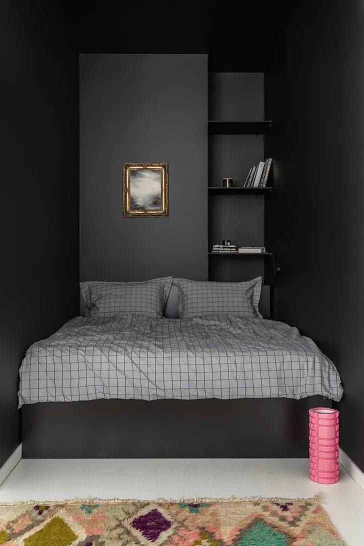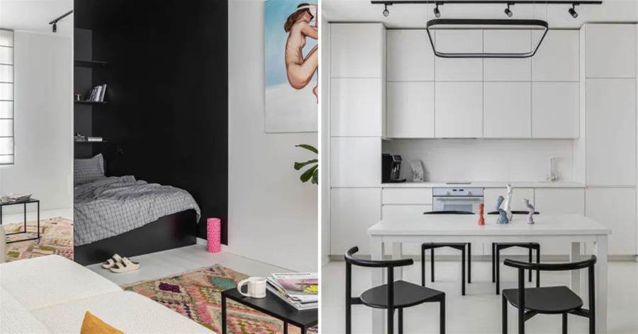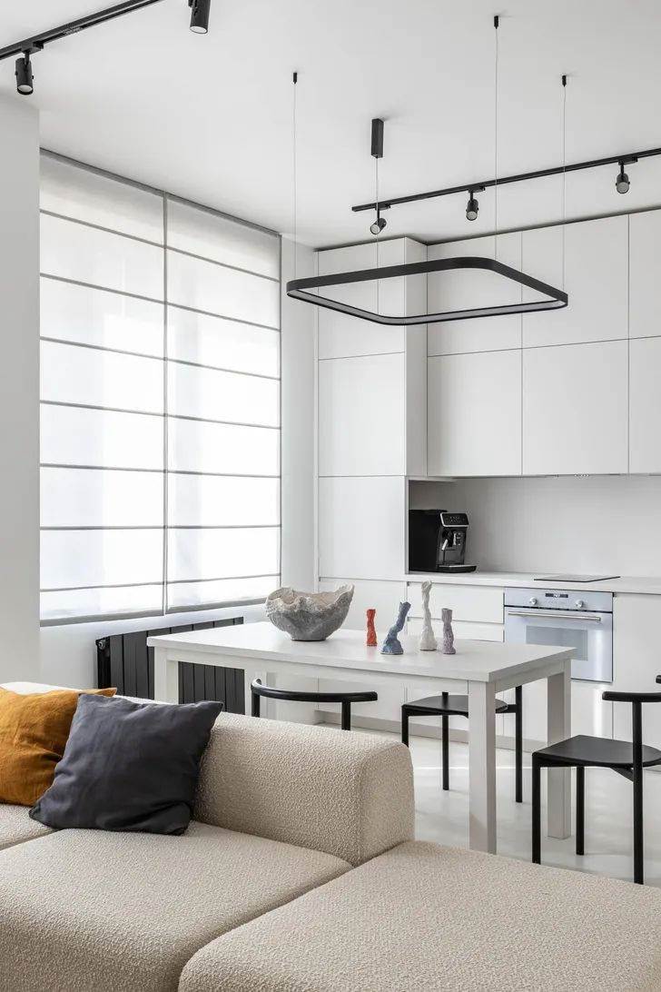 開發商的布局有一個單獨的廚房和房間,但設計師 Dacey Ausheva 建議客戶拆除隔斷,以騰出一個開放空間。廚房兼客廳結合在一起,公寓有兩扇窗戶,光線充足,空氣流通。設計師將原本與更衣室共用空間的臥室藏在一個壁龕里,「推」進公寓深處,在正前方附近有一扇客廳窗戶,所以這里也有足夠的光線。