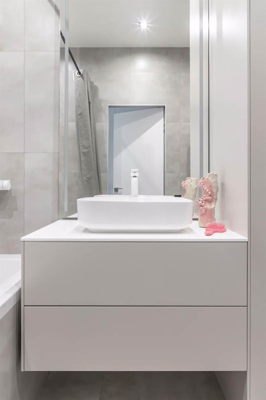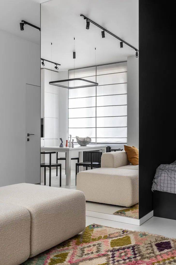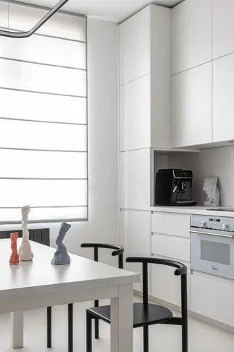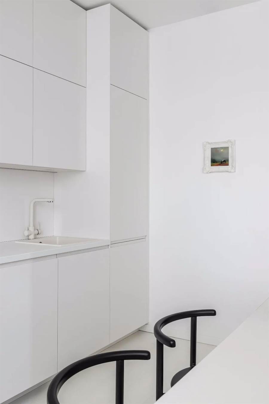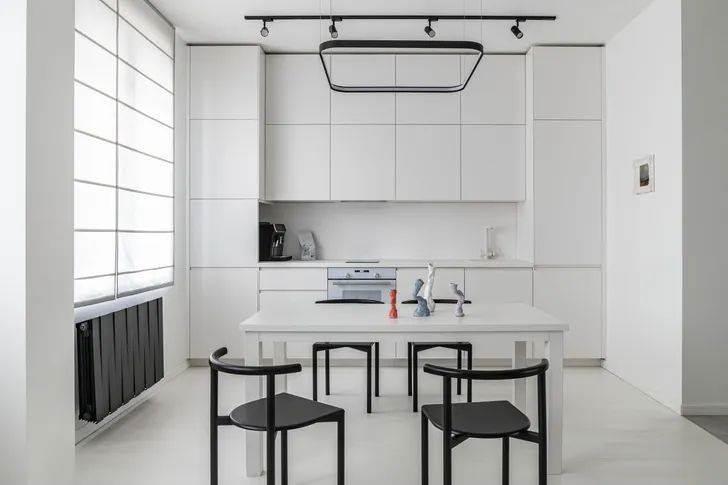 公寓的主人是一名職業醫生,希望公寓是黑白色的,線條和形狀清晰、嚴格。但在設計過程中,她和設計師意識到,在簡潔飾面的背景下點綴一些明亮的色彩是讓空間充滿活力的必要條件。同時,設計師決定讓它們「移動」——如果心情發生變化,你可以隨時將粉色花瓶推得更遠。