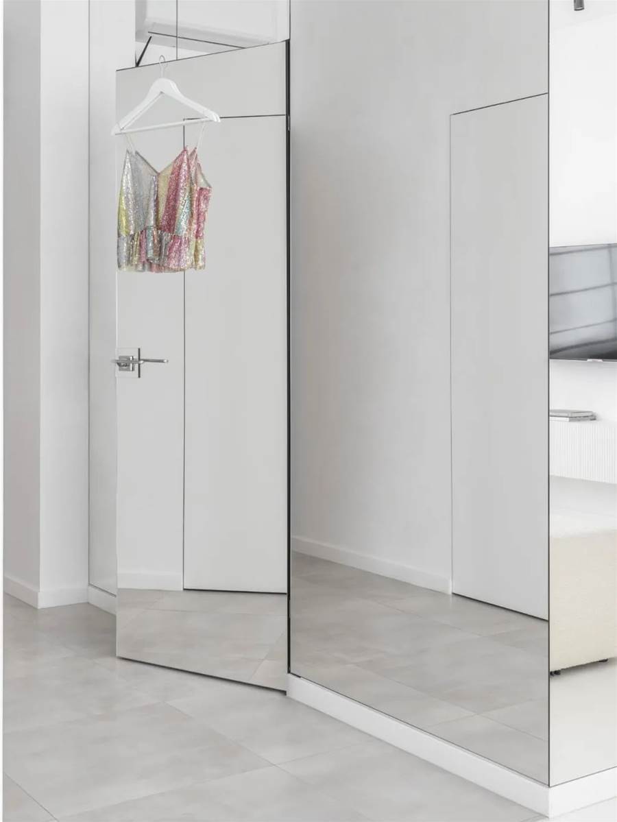 更衣室的外墻和門的天花板上裝飾有鏡面板 ——它們反射窗戶的光線,在視覺上擴大了空間。大鏡子也是主人的一個愿望。
