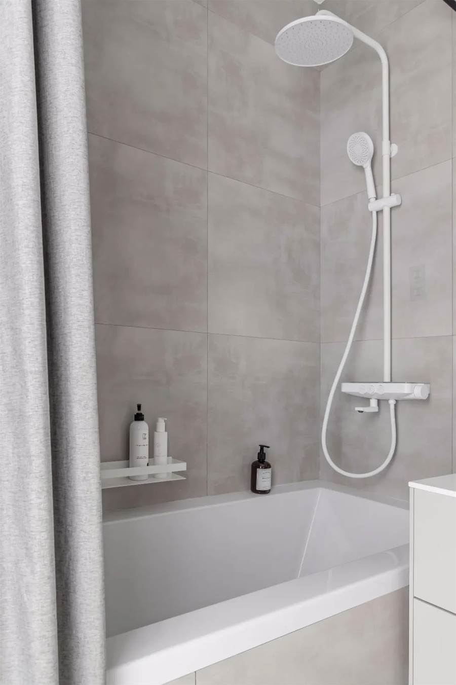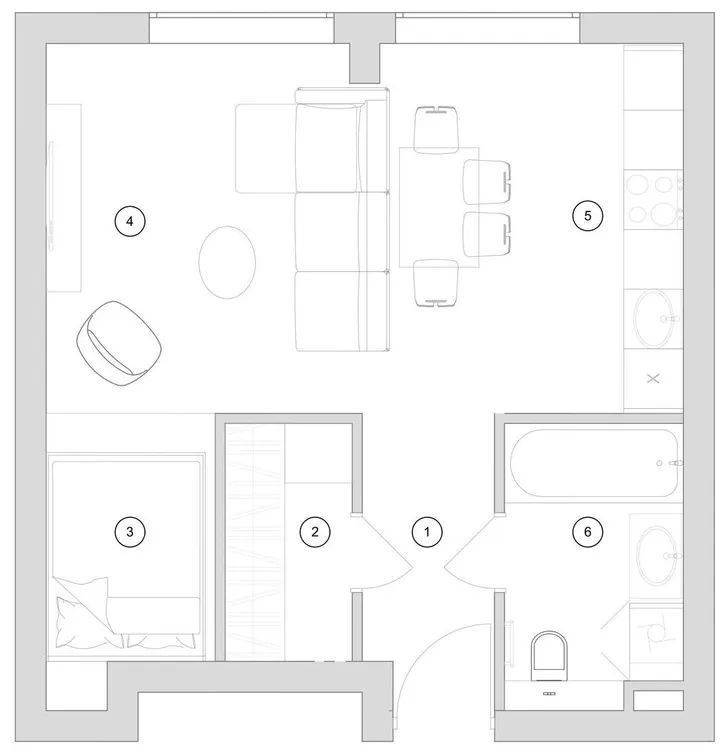 清晰的分區使得在小公寓中分配業主所需的所有區域成為可能:一個有充足存儲空間的廚房和一個可容納四人的用餐區;客廳配有電視和大沙發;睡覺的地方在壁龕里;寬敞的浴室配有洗衣機和烘干機的衣柜以及設施齊全的更衣室。
