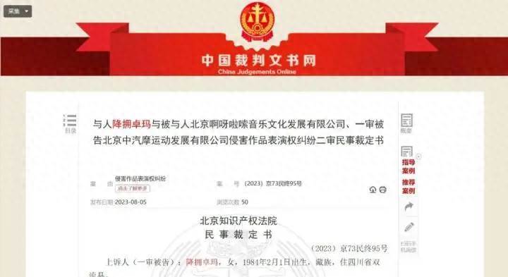 2024年1月16日經宜昌市中級人民法院一審、湖北省高級人民法院二審,歌手降央卓瑪和湖北某文化公司侵害刀郎著作權一案最終宣判,刀郎勝訴,降央卓瑪及其所在公司需支付侵權賠償75000元。