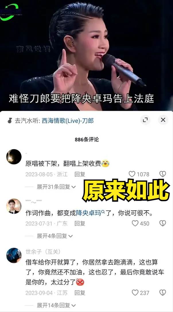 而且,更搞笑的是,在某音樂平台,刀郎版的《西海情歌》被下架,反倒是降央卓瑪版的《西海情歌》在付費訂閱,簡直滑天下之大稽。