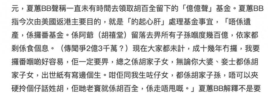 胡百全與發妻育有三個子女,與黃夏蕙育有七個子女,也就是說名義上是這10個子女都可以從胡禧堂的基金會領取錢,相對而言黃夏蕙這一方就占有絕對優勢,倘若真要分身家,她拿到的份額更多。而根據1980年她與胡百全簽訂的協議可知,黃夏蕙是可以從胡禧堂的基金會中提取利息當成家用,而若是分身家,她的七個子女可以拿到2.